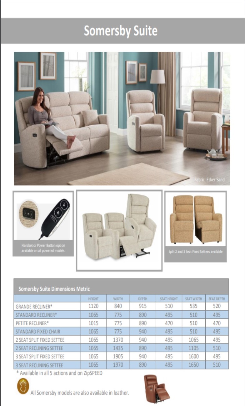 LHF and RHF sofa recliner options available as well as double recliners in standard sizes. LHF (left hand facing) the arm is on the left hand side of the unit when viewed from the front. RHF (right hand facing) the arm is on the right hand side of the unit when viewed from the front. Upholstered finger guards and valances on recliner models. All measurements are approximate and relate to the overall size of the item including soft arm cushions where fitted and back cushions. All recliner furniture supplied on glides only. Available in a selection of fabrics and leathers. Arm caps available in fabric only at extra cost. Recliner available in manual or power versions. Standard furniture in fabric covers have loose seats which are reversible. All other furniture including recliner and leather pieces have fixed seats. 2 seater recliner sofas are delivered in two sections which link together. 3 seater recliner sofas are delivered in three sections which link together. Our recliner furniture requires room to recline. Please allow the clearance detailed above to go into the full recline position. Scatter cushions are available at extra cost.